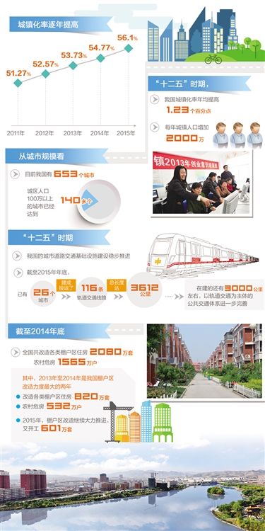 “2015年,我国城镇化率达到56.1%,城镇常住人口达到7.7亿。‘十二五’时期,我国城镇化率年均提高1.23个百分点,每年城镇人口增加2000万,比欧洲一个中等规模国家的总人口还要多。”国家发展改革委副主任胡祖才在不久前召开的国新办新闻发布会上表示。