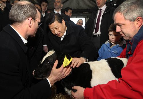 2月19日,正在爱尔兰访问的国家副主席习近平在爱尔兰农业部长科文尼(左一)陪同下参观考察爱尔兰詹姆斯·林奇农场。