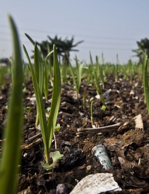 在附近的菜地里,有才出土不久的蒜苗,与电池、口服液玻璃瓶、碎玻璃一起生长。在一块已经长出大白菜的地里,腐烂的树叶破布已经分解不见了,只留下很难分解的塑料袋和废电池。