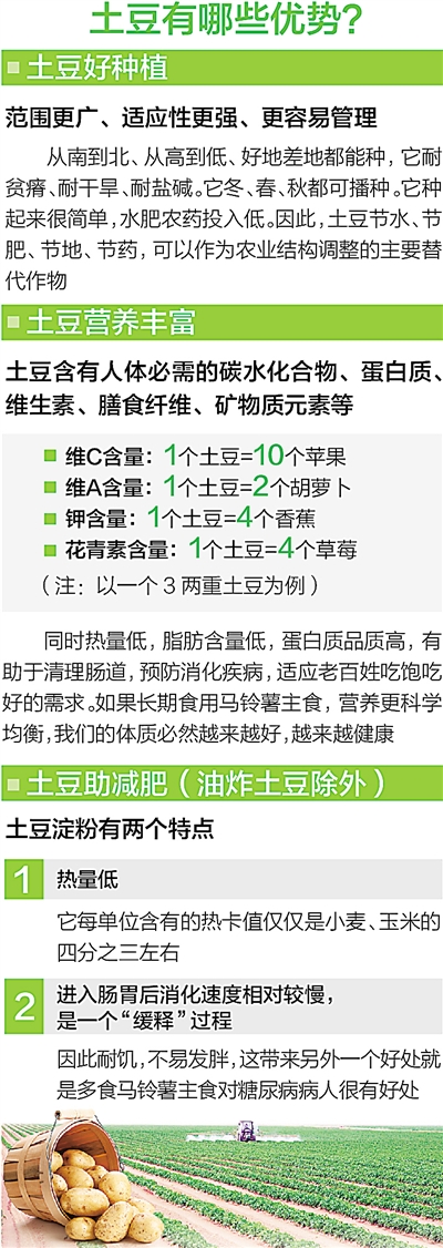 据他介绍,农业部提出推进土豆主粮化,主要基于三点考虑:第一,可以顺应大家吃饱吃好吃得健康的需求。土豆营养丰富全面,同时脂肪含量低、蛋白质品质高,利于抑制体重,有助于清理肠道、预防消化系统病变。第二,可以顺应结构优化和资源开发的需要。我国水土资源严重短缺、生态环境压力越来越大。在水资源短缺的西北、地下水严重超采的华北和冬闲田资源丰富的南方等地区,要转变发展方式、优化种植结构。土豆生产节水、节地、节肥、省药效果好,可作为农业结构调整的主要替代作物。第三,顺应城乡居民生活快节奏的新变化。土豆易加工、口味好、营养全,无论在快餐店还是在寻常百姓家都备受欢迎。推进土豆主粮化,把马铃薯加工成方便食品、半成品,能适应生活快节奏的需要,省时、好吃、营养。