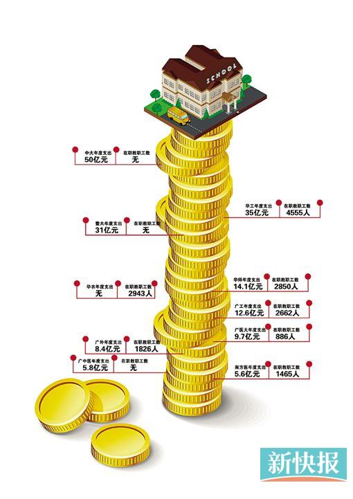 残缺不全的数据显示,华师的工资福利总额名列前茅。其计划4.3亿元用于支付教职工工资福利,在当年总支出中占比超过三成,假如以2850名在职员工数简单相除,人均全年“收获”15.1万元。广工的工资福利总支出虽较华师略低3000万元,但人均值同样是15.1万元。