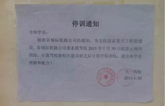 该驾校一学员雷滴雨告诉记者,1月30日早上,她到驾校准备练车时,看到驾校墙上贴着一张停训通知,称驾校从2015年1月30日起停训,“但没有写明停训会持续到什么时间。而且在此之前,教练和驾校没有通知过要停训,也没听说过学校要搬迁的消息。”