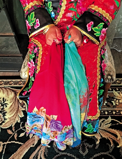最后的装扮开始了,伴娘托出搁在丝绒衬垫上的现代金饰和绒花,娘家一盘,婆家一盘,满当当的两大盘被戴上手指,挂上脖子,插上乌黑的鬓角发梢,一红一绿两条丝绸手帕绕过食指用拇指压住。