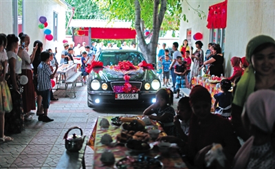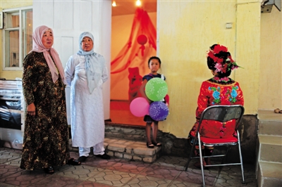 下午两点多钟,参加婚礼的人陆续散去,列纳特的大伯说,按照回族婚礼习俗,第二天,新娘阿谢拉要在公婆和男方亲戚面前展示自己下厨做事的才能,第三天,新郎列纳特要准备礼品陪同新娘回门,看望岳父母及亲属。除此以外,新娘家亲戚还要一家挨一家地请新郎、新娘吃饭,并给新娘回赠礼物。而回门的当晚,新郎要赶回家中,新娘一般要在娘家住上三五天或一星期后再由娘家人送回家或新郎自己来接回家。
