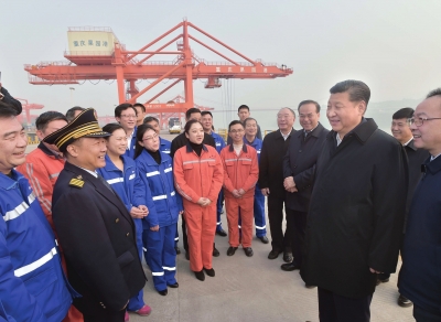 1月4日至6日,中共中央总书记、国家主席、中央军委主席习近平在重庆调研。这是1月4日下午,习近平在重庆两江新区果园港与现场作业人员亲切交谈。 新华社记者李涛摄