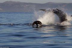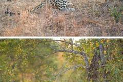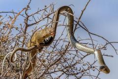 花豹发现了树上的巨蟒,一跃而起咬住食物,奈何巨蟒卡在树上很紧,花豹一时也不能将其扯下。拉扯之下巨蟒的内脏都露出来了,即使是如此大力,巨蟒依然没有掉落。花豹开始蹲在一边另想对策。它最终跳上树将巨蟒从另一边推落树下,终于得到了美食的花豹欢天喜地的带着蛇跑掉了。