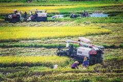 在儋州,水稻已经进入收获季,越来越多的农民不再为收割水稻而烦恼。按今年收割水稻的市场价格,每亩只要花80元,就有收割机专业队到田间帮忙收割,既省事省工,又大大提高了稻谷的回收率。图为儋州市东成镇崖碧洋田间机械收割水稻的场面。 特约记者 吴文生 摄