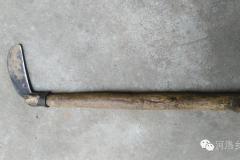 疙瘩镰木质手柄,纯手工打造,木杆有体工学S形曲线。洛阳山区农村早期镰刀,甚至有58年大炼钢铁时期幸存刀头。俗称:“疙瘩镰”,生铁锻打制造。锯刺镰山区已经很少见到,镰刃有稍微倾斜度,多用于割草。散镰大多是只售镰刀刀头,农民自行制作镰柄,名字来历不详。快镰解放后西方传入的镰刀形状,镰刀多用钢..