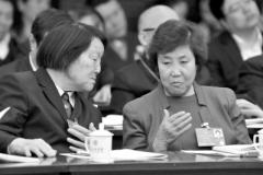 3月6日下午,在山西代表团媒体开放日上,两位来自基层的女性全国人大代表——平顺县西沟村党总支副书记申纪兰(左)、昔阳县大寨村党总支书记郭凤莲(右)在讨论政府工作报告。 本报记者戴军摄 本报记者..