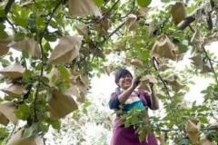 套袋果农最辛苦,一早到晚围树走果子就像亲生娃,天天瞧着它长大一进五月套开袋,农村妇女像比赛早上起来刚开门,满街都是套袋人?男的夹着梯子走,女的赶忙跟后头果树园里真热闹,枝头鸟儿喳喳叫你上树来我梯站,个个果子被袋缠女的把脸捂的严,男的一身穷打扮夫妻手动不说话,枝杆挂的是戏匣套袋虽然活不重..