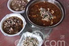女 :“土家山寨风俗多,贵客来了请上座。坐嘛,先敬一碗保护酒,再来尝尝土家菜,好特色,好特色。尝一下嘛。” 云飞:“我发现了这菜的特点都有这种豆子。这是什么豆子啊?” 女:“ 先尝一下嘛。” 云飞:“这个豆子吃起来的口感有点像煮熟的蚕豆,但看起来又像花生..