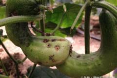 症状特点子叶受害, 初期产生黄白色近圆形病斑, 随病情发展导致全叶干枯死亡。幼嫩茎秆发病,初期产生水渍状梭条形病斑,后期病斑变暗色,凹陷龟裂。真叶发病,初期产生近圆形褪绿的小斑点,病斑逐渐呈黄白色干枯,易造成边缘不整齐、呈放射星纹状的穿孔,病斑外围出现黄色最圈。叶柄、瓜蔓受侵,产生疮痂状中部凹陷..