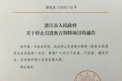 6月27日,湖北省潜江市人民政府新闻办公室发文指出,经市委、市政府研究,决定停止引进奥古斯特项目,希望广大市民不信谣、不传谣,遵纪守法,共同维护潜江良好发展大局。事件发生前后2016年6月2日,潜江市环保局公布上述建设项目环境影响评价书,信息显示,该项目的农药原药涉及80余种各类农药,包括氟环唑..