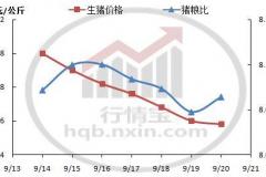 上周行情回顾 持续下跌 上周(9月14日至9月20日)全国生猪(外三元)均价继续保持下跌态势。至9月20日,全国外三元均价跌至17.58元/公斤。玉米价格较上周跌势扩大,上周累计下跌50元/吨。猪粮比上周最低降至8.05:1。 数据来源:农信互联·行情宝 上周全国生猪价格持续呈下跌态势,截至本周末东北多地跌..