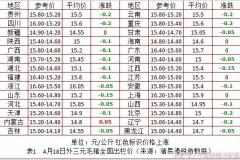 各位猪友大家好,今天是2017年4月18日周二,现在由阿乐带来今天最新的猪价变化!今日全国生猪出栏均价为15.15元/KG,相比昨日下跌0.09元/kg,下跌幅度0.59%,猪粮比7.99:1。各地详细数据表1我们可以看到今日在跟踪的28个地区中,处于下跌的有四川、贵州等22个地区,下跌幅度0.05-0.2元/kg;处于上涨的有内蒙..