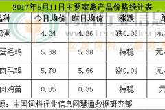 据饲料行业信息网慧通数据研究部数据统计,2017年5月11日中国主要家禽产品价格稳中震荡。其中鸡蛋价格跌幅收窄,淘汰蛋毛鸡价格止跌维稳;白羽肉毛鸡价格止跌回升,白羽肉鸡苗价格低位持稳。鸡蛋市场:目前蛋商观望情绪较强,养殖户低价惜售,其中山东局地走货加快,蛋价稳中小涨,预计短期内蛋价稳中小幅调..