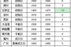 “农业家内参”农畜产品行情报告(元/公斤)地区市场当日价格前一日价格涨跌比北京市北京盛华宏林粮油批发市场有限公司4.84.83-0.01北京市北京大洋路农副产品市场有限公司4.54.50北京市北京市新发地农产品股份有限公司5.595.590北京市北京锦绣大地玉泉路粮油经营有限公司4.664.660天津市天津市金钟河蔬菜贸易..