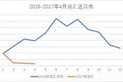 据有关部门统计,2017年1月--4月我国的猪肉进口量达到了历史最高水平,1-4月共累计进口猪肉45万吨,同比增长了11%。其中雨润、中粮肉食、龙大、金锣等肉企,都在今年加大了猪肉进口量。可是,国内肉企的龙头老大,却在今年大幅降低了猪肉进口数量,而且是同比下降高达80%。蓝色代表2016年双汇进口猪肉量走势..