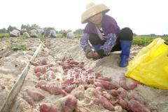 25日,在企水镇番薯种植基地,工作人员正在田里收获番薯。本报记者 刘冀城 摄一公斤红薯可卖到10元!昨日,在雷州企水镇田园村1700多亩连片的红薯生产基地里人头涌动,大家分工合作,有的在忙于收获,有的在认真分拣,有的在有序装箱,将这产自雷州西海岸的红薯销往广州、上海等一线城市。基地种植户、喜原..