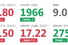 全国生猪价格(内三元、外三元、土杂猪)、玉米价格、猪粮比、豆粕价格一览表:近5日外三元价格走势图:近5日内三元价格走势图:近5日土杂猪价格走势图:近5日玉米价格走势图:近5日豆粕价格走势图:全国各省生猪、玉米、豆粕价格汇总:
