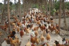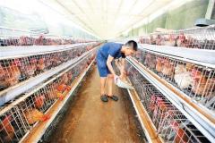 近日,在海口市大坡镇牧榕文昌鸡养鸡场,饲养员在用粗粮配料喂鸡。据了解,琼山区云龙、红旗、三门坡、大坡等实施发展牧榕牌文昌鸡产业,带动当地农户养鸡脱贫致富。目前,牧榕文昌鸡实行“公司+合作社+基地+农户”的模式经营,一条龙跟踪服务,保价回收农户合格的商品鸡,带动了18个养鸡专业合作社的54个养..