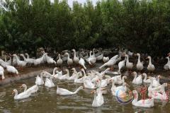 9月5日,在襄州区双沟镇陶王岗村的桃园,成群的白鹅正在桃树下觅食。今年以来,湖北盛华富农农业公司在陶王岗村承包了2000亩土地,种植桃树、葡萄和西瓜等,发展现代农业。公司在其中100亩土地种植桃树,在桃树下养鹅。鹅吃树下的草,鹅粪肥了地壮了树,今年又大又甜的桃子吸引很多人前来采摘,生态放养的鹅..